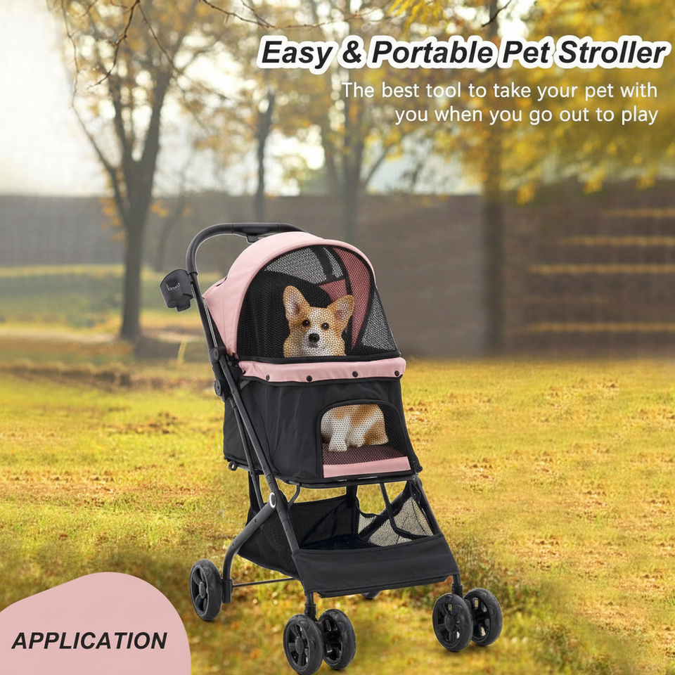 TH-PPS-632 Premium Pet Stroller 4 Wheel with One-Touch Folding, Breathable Mesh Windows and Safety Belts