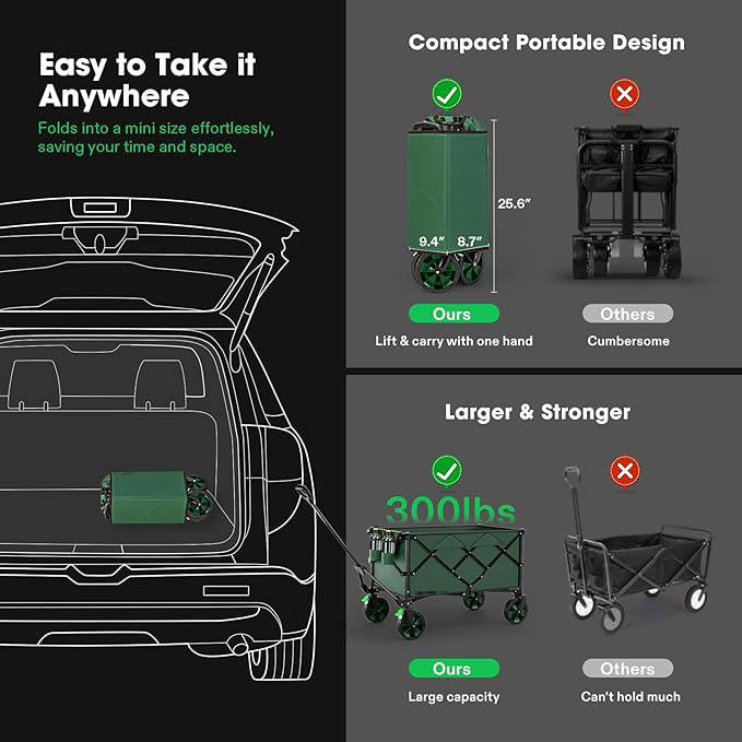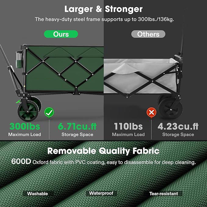 THCW10167 - Heavy Duty Folding Collapsible Wagon Utility Outdoor Camping Cart with Universal Wheels & Adjustable Handle, Green