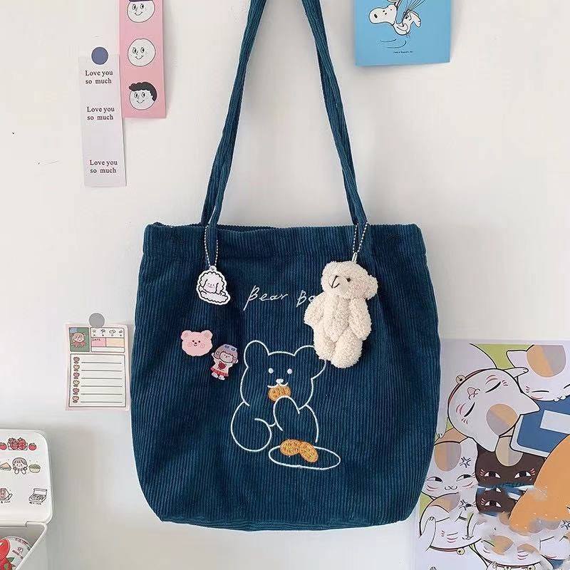 THK Embroidery Cute Bear Woman's Shoulder Bag Corduroy Shopping Tote Bags