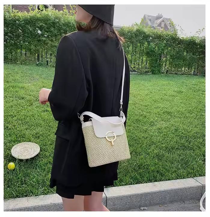 THK0420 Women's Fashion Crossbody Straw Handbag Small Bucket Bag with Zipper Closure Hollow Woven for Holidays