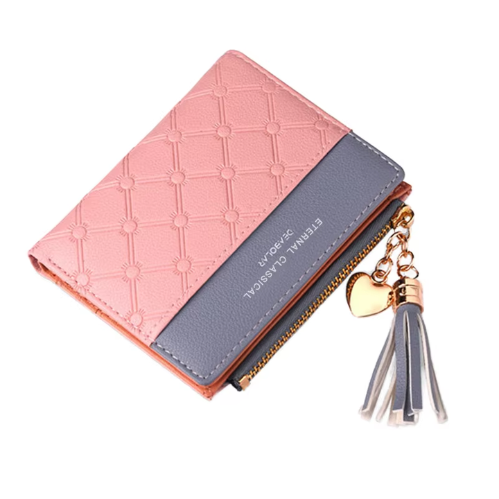 THK0438 Women's Splicing Color Fringe Short 2-Fold Lightweight PU Leather New Fashion Lady Zipper Wallet with Wrist Credit Cards