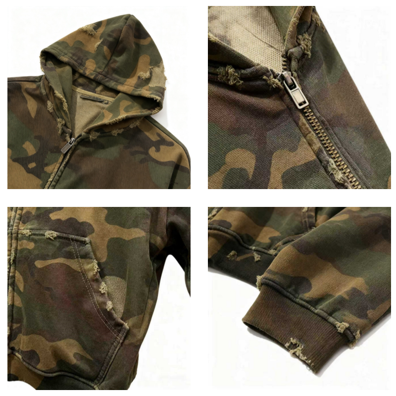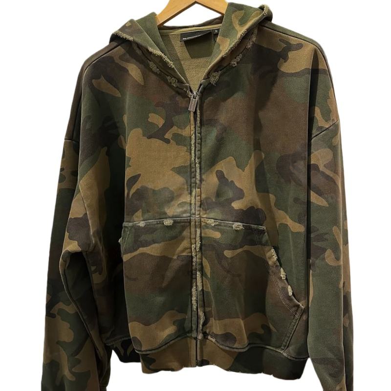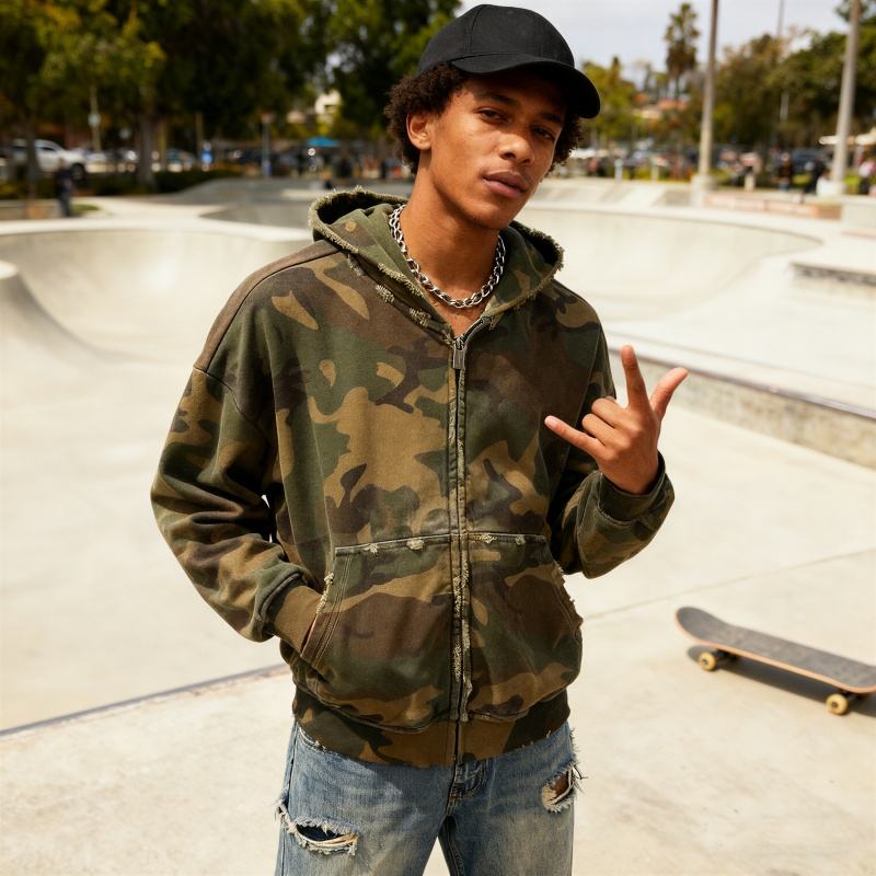 TKAN270D Custom Streetwear Men's Heavyweight Cotton Oversize casual vintage Distressed Camo Zip up Hoodie