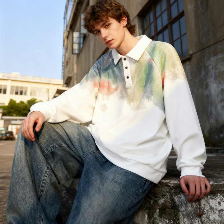 TKAN465D Winter season long-sleeved men's fashion loose and personalized gradient tie-dye printed Turn-down Collar T-shirt