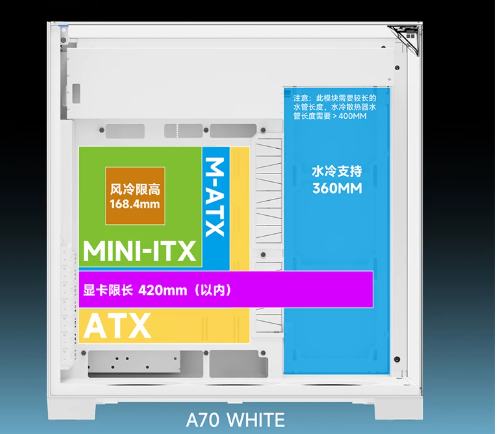Supports up to 360mm radiator at bottom side, 2*120mm fans at rear
