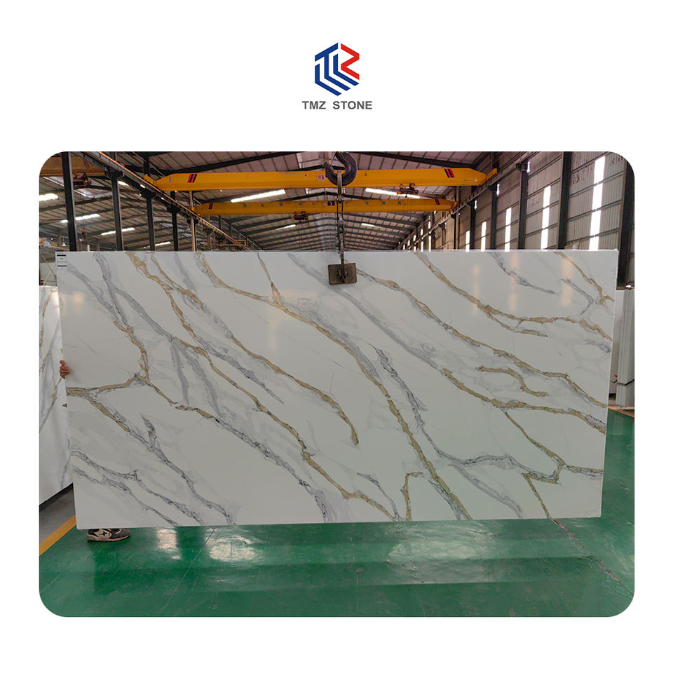 TMZ 5066 Calacatta Fendy Modern Fire Resistant White Artificial Stone Countertop Slab for Living Room TV Wall Hotel Kitchen