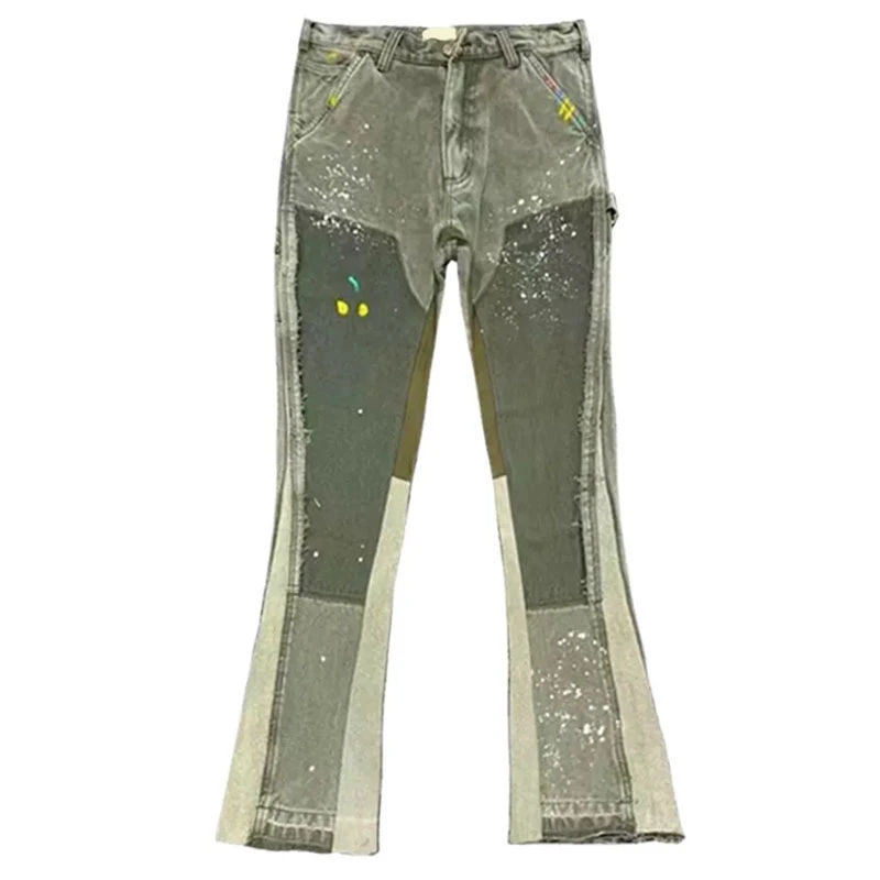TOP NEW High Quality Custom Vintage Color Contrast Panel Men's Stacked Jeans Distressed Hem Flare Carpenter Denim Jeans Pants