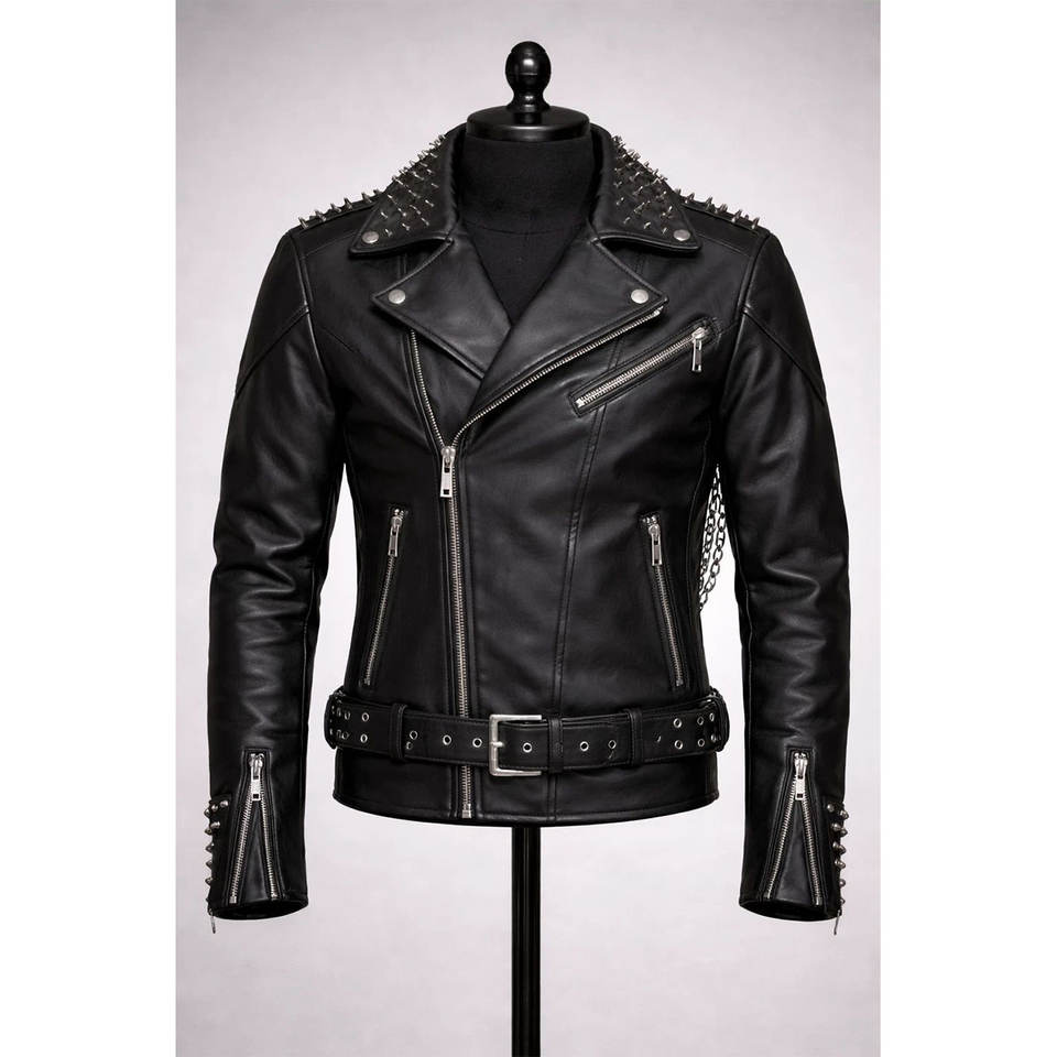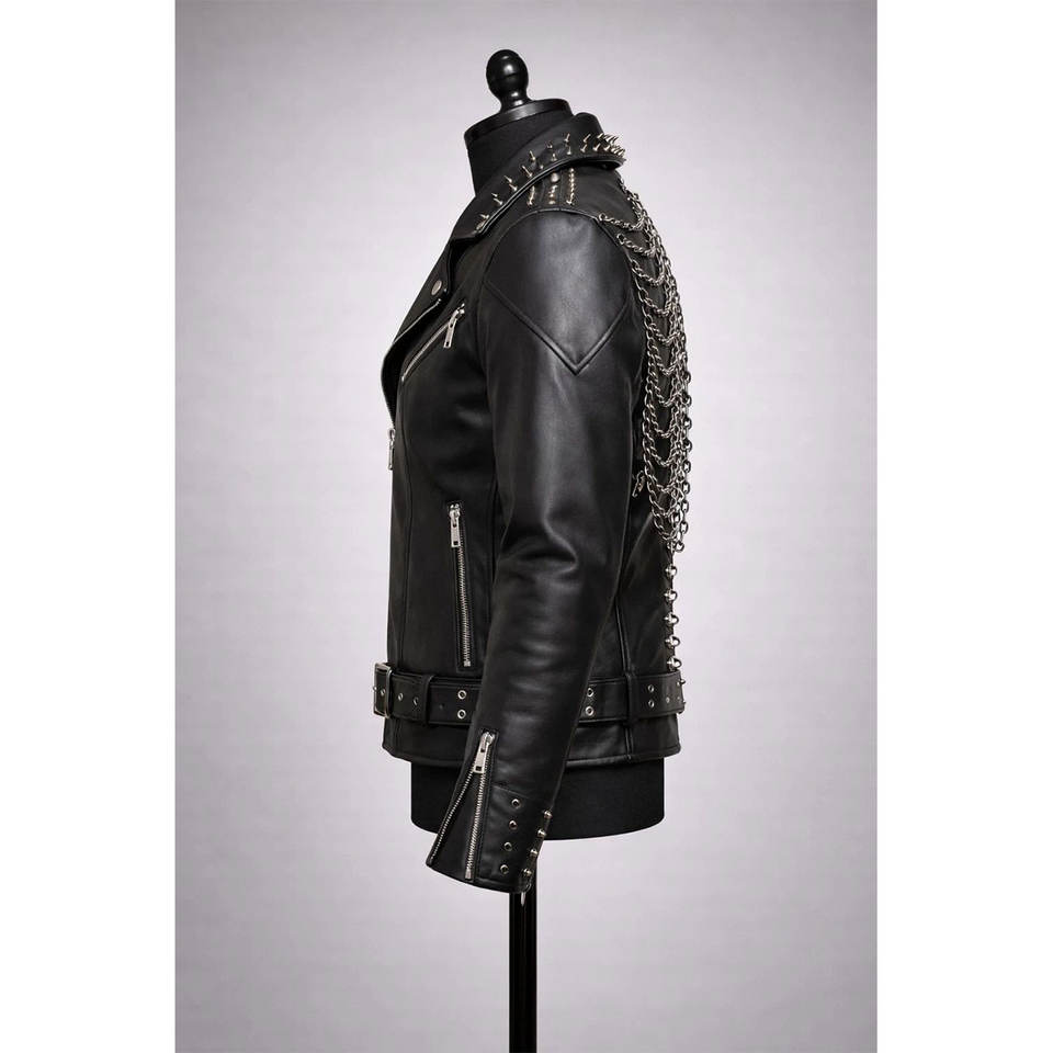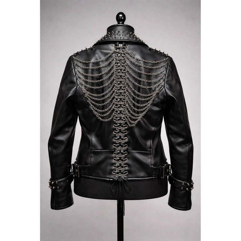 TOP SELL Gothic Skeleton Rib-Cage Cowhide Jacket Studded Black Jacket with Drape Chains UNISEX