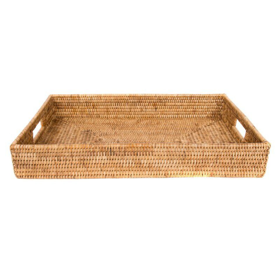 TOP SELLING Hand-Woven Natural Rattan Serving Tray with Handles - Round Eco-Friendly Decorative Wicker Tray for Coffee Table, Br