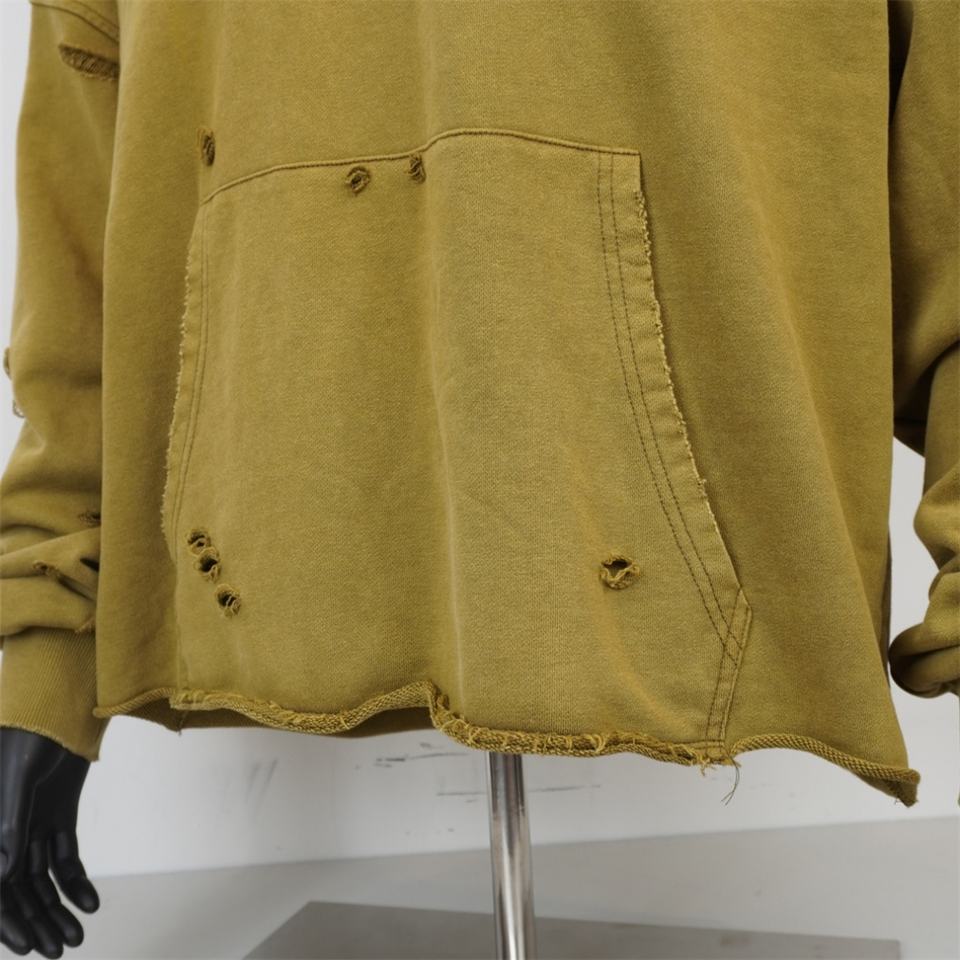 TOPSHOW Streetwear High Quality Vintage Ripped V-neck Blank Drop Shoulder French Terry Acid Wash Distressed Cropped Hoodie Men