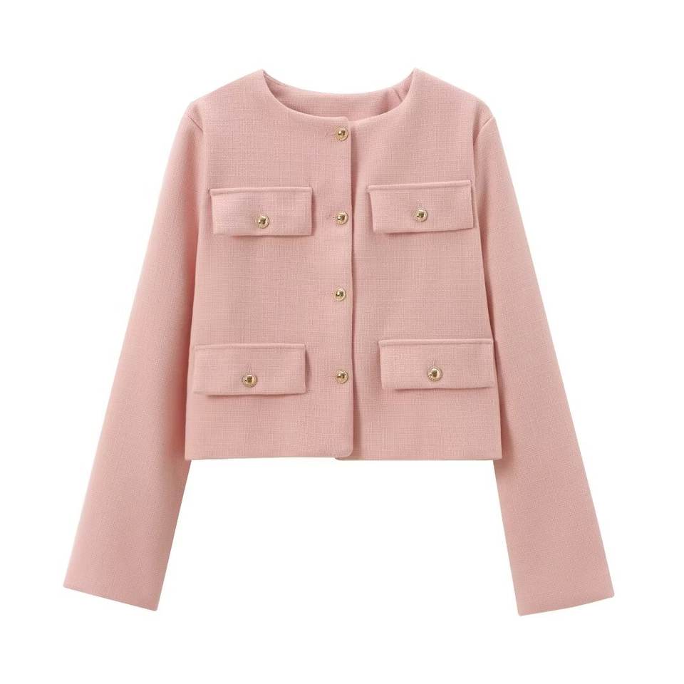 TRAFZA Women's Elegant Long Sleeve Coat Single-Breasted Textured O-Neck Design Flip Pocket Decorate Short Jacket Autumn