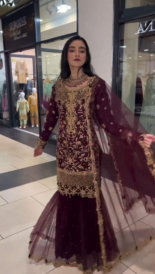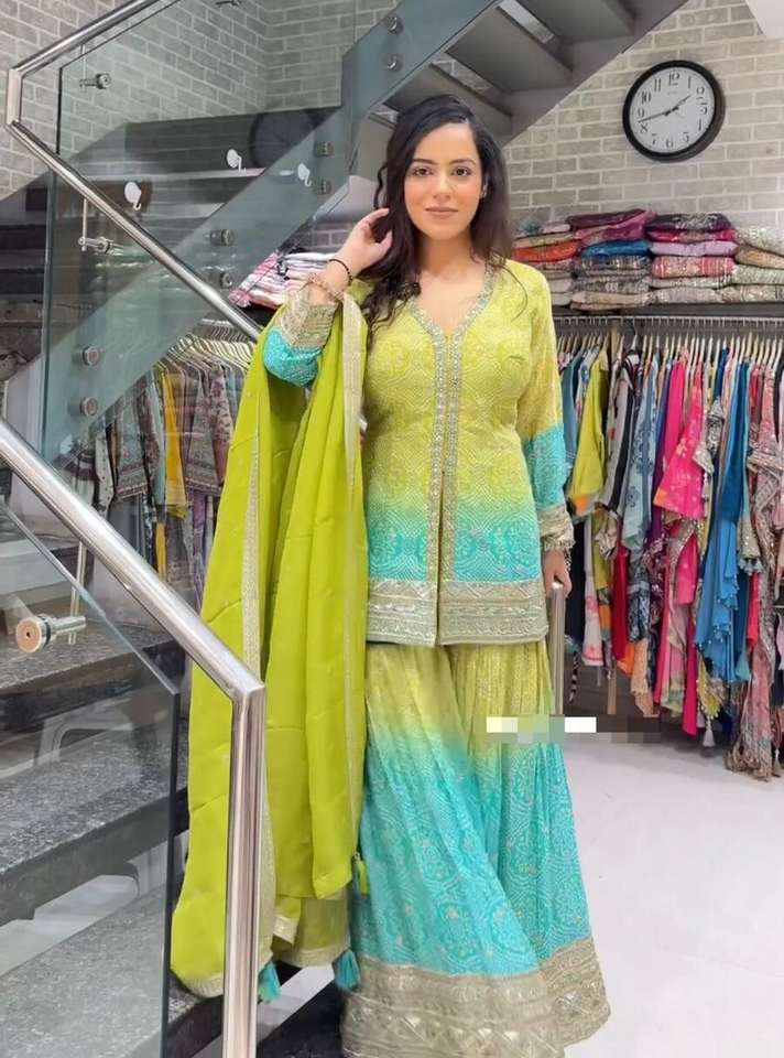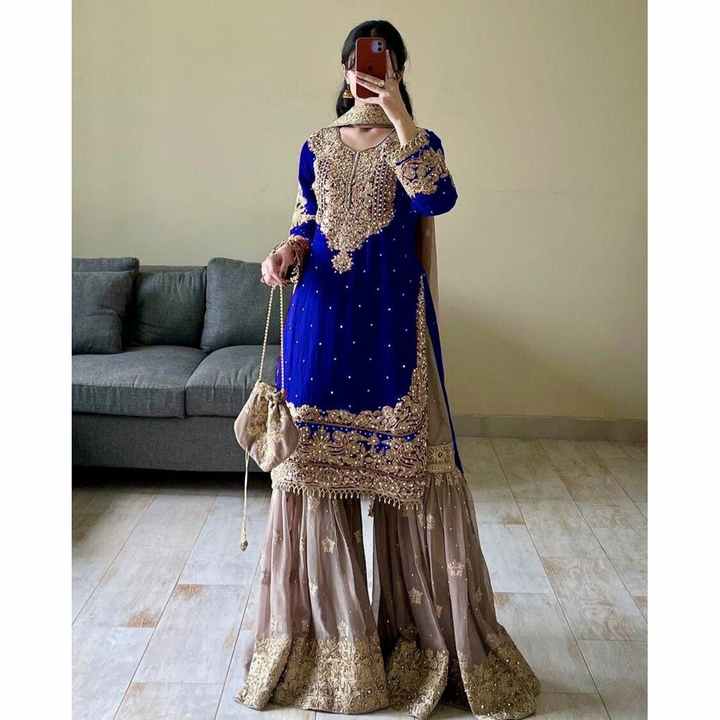 TRENDING GEORGETTE CODING SEQUENCE EMBROIDERY LONG WORK TOP SHARARA with DUPATTA NAVY BLUE VINTAGE