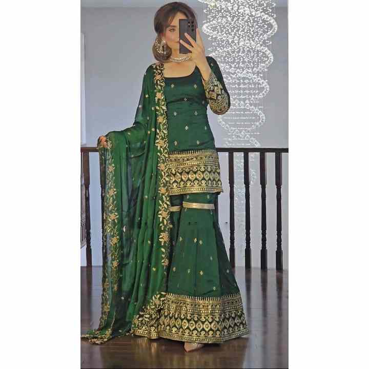 TRENDING VICHITRA SILK EMBROIDERY SEQUENCE WORK TOP SHARARA with DUPATTA in GREEN