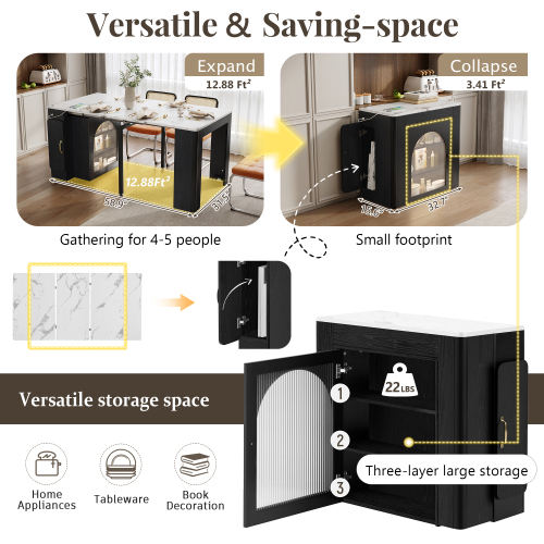 TREXM Modern Extendable Dining Table 3 Removable Middle Leaves Mobile Rolling Island Table Featuring Power Outlet