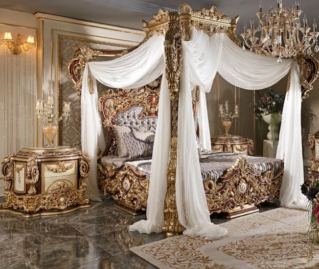 TRIHO Furniture Imperial Classic Style Rococo Furniture Hand Made Solid Canopy Carved Wooden Bed