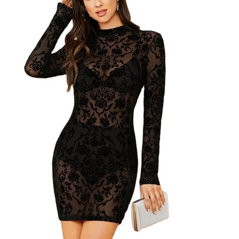 TUV and GOTS Custom Organic Fabric Excellent Quality Fashion Stand Collar Sheer Flocked Mesh Bodycon Dress