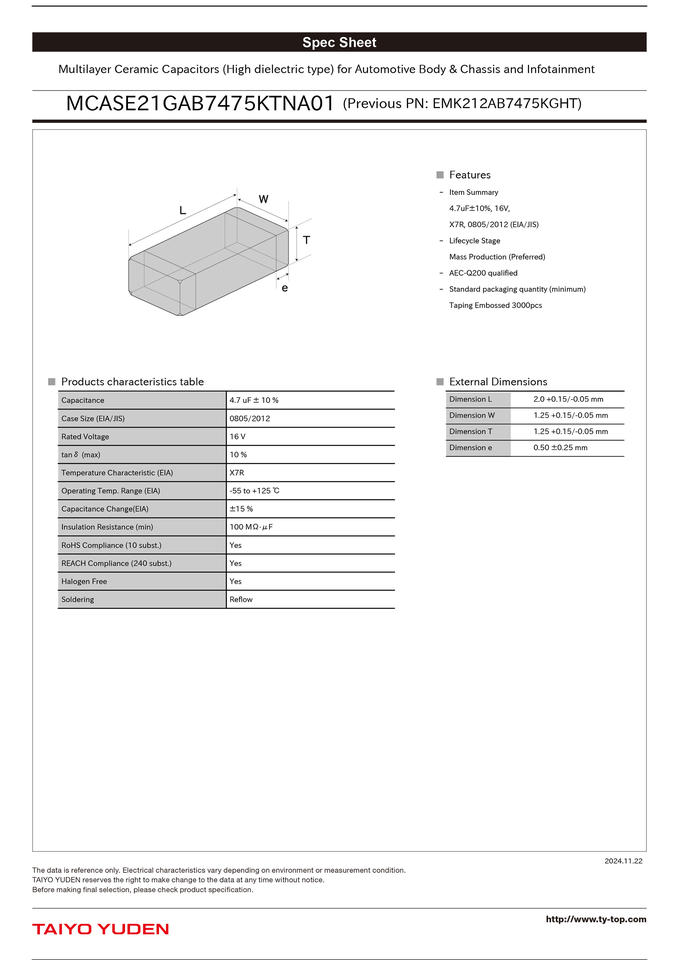 SMT 0805/2012 X7R 16V 4.7UF ±10% 3K/R AEC-Q200Description