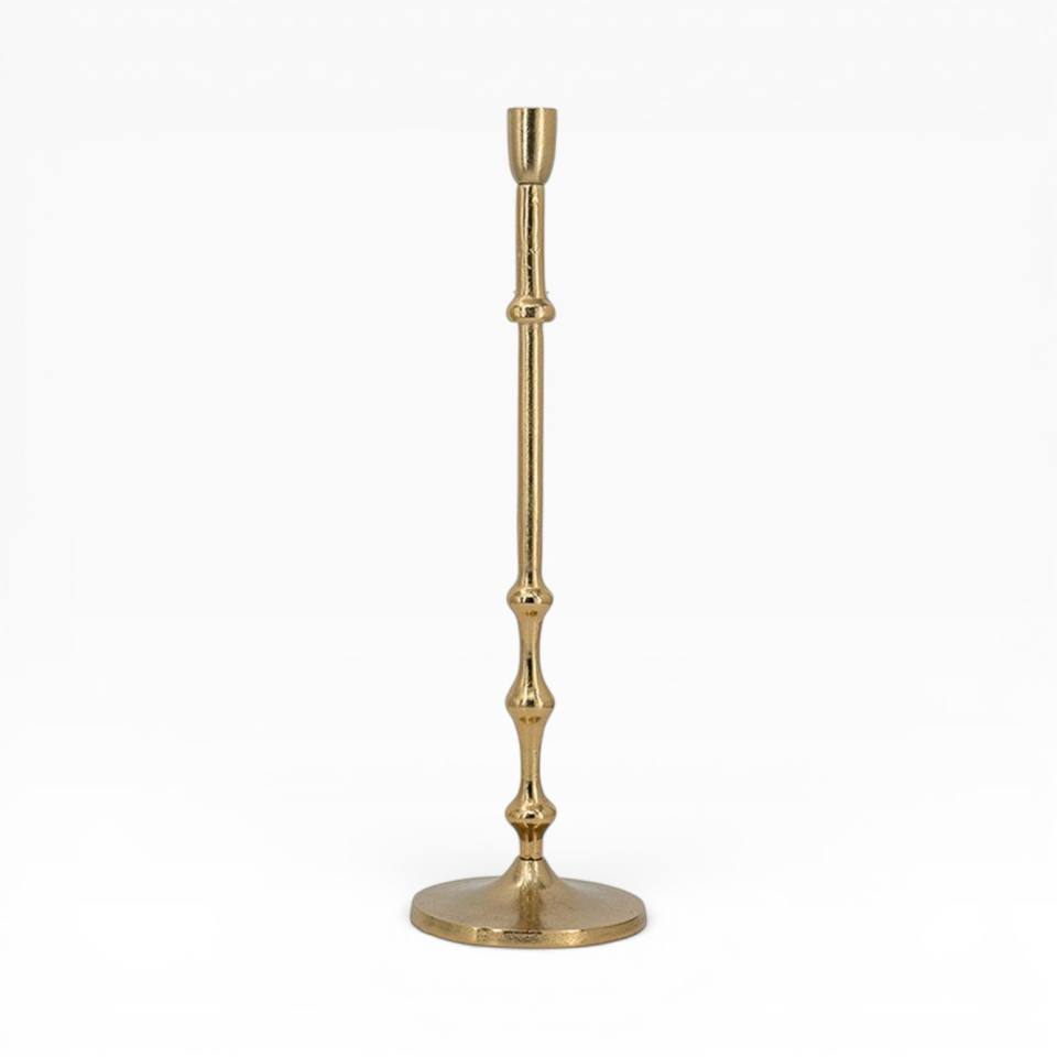 Tall Gold Metal Candle Holder With Slim Turned Stem And Wide Stable Base For Elegant Dining And Premium Home Decor