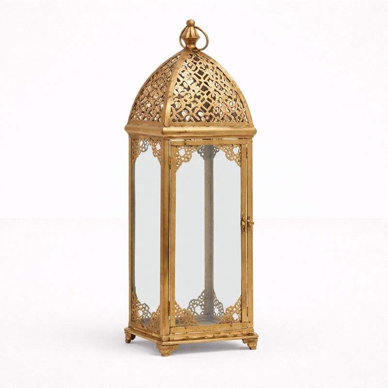 Tall Luxury Gold Metal Lantern with Glass Panels Intricate Cut Dome Design Elegant Candle Holder for Premium Home Decor
