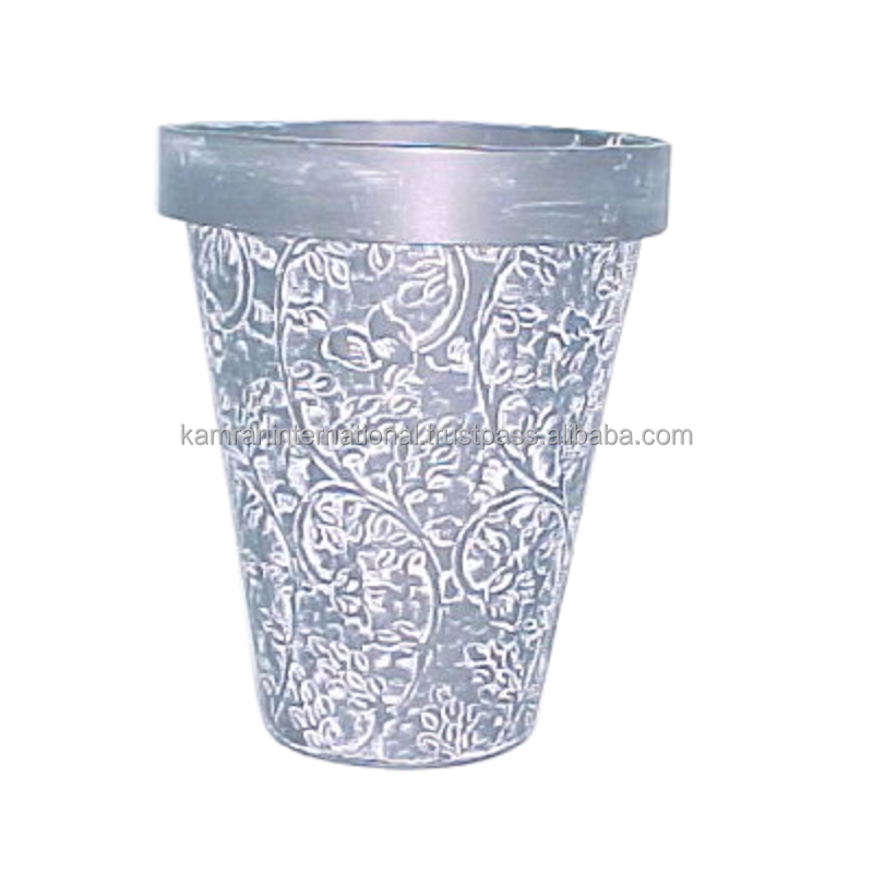 Tall Tapered Silver Planter with Leaf Embossed Vine Pattern Decorative Galvanized Metal Flower Pot for Modern Farmhouse Decor.