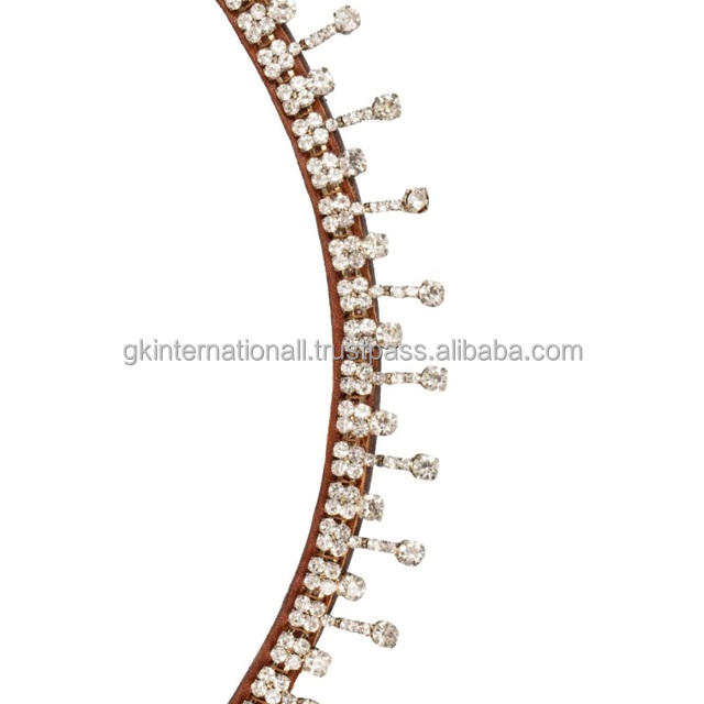 Tan Brown Genuine English Saddle Leather Horse Brow Band Decorated with Luxury Hanging Crystal Diamante Chain Dressage Brow Band
