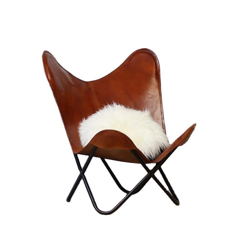 Tan Leather Lightweight Butterfly Leisure Chair Foldable with Black Iron Frame for Bedroom Outdoor & Living Room Use