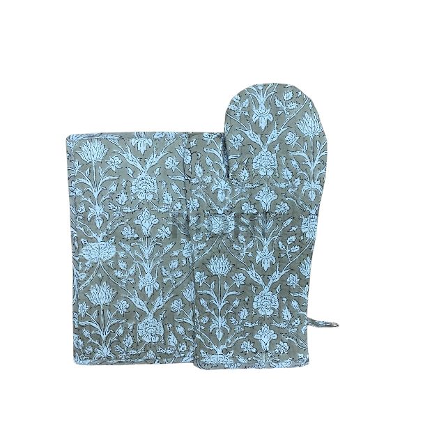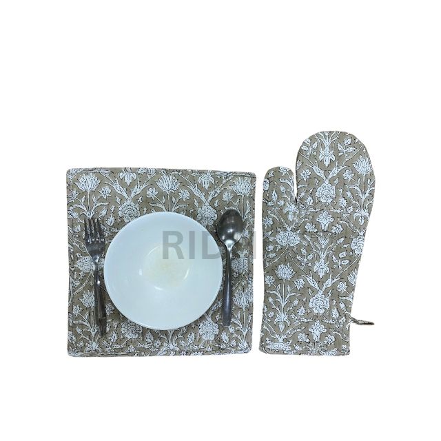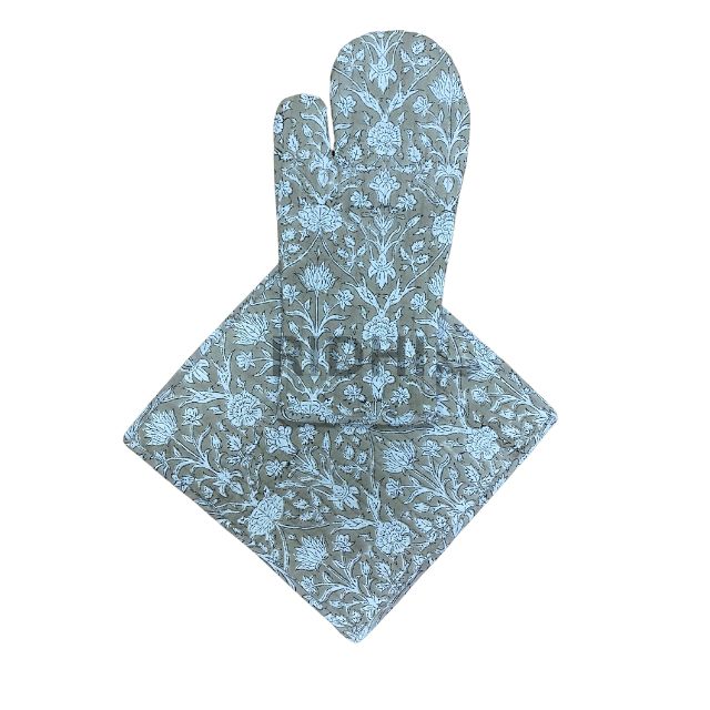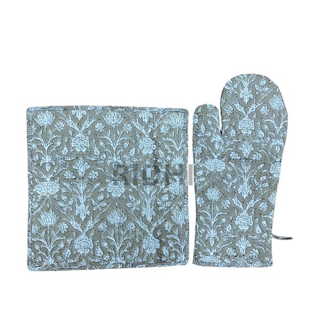 Taupe Floral Quilted Oven Mitt & Pot Holder Set Indian Hand Block Printed 100% Pure Cotton Kitchen Accessories