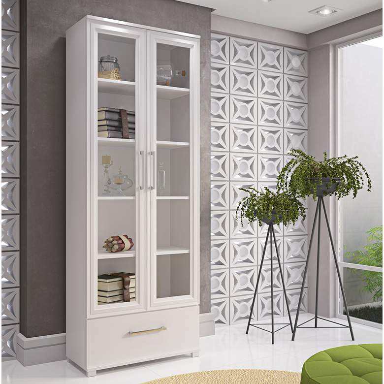 Description:tall display shelf made of teak wood with glass doors and drawers.