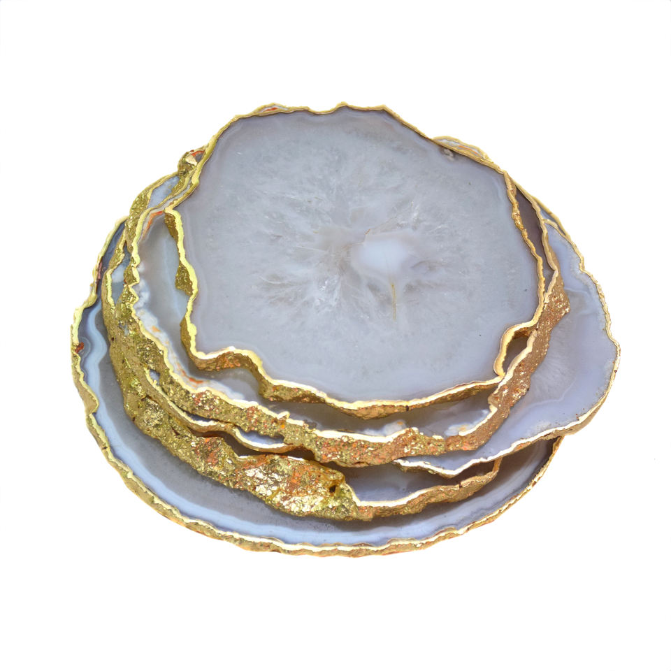 Tea Coaster Round Shape With Gold Rim Beautiful Super Quality Natural Crystal Gemstones Natural White Salt Color
