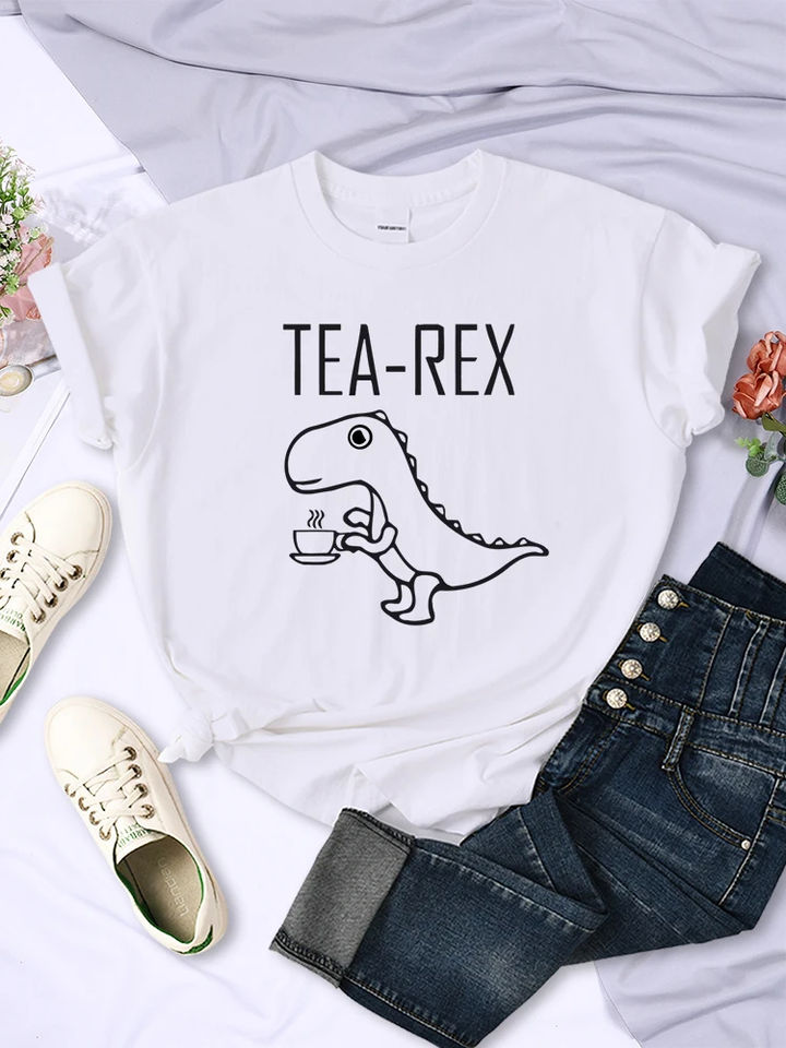 Tea Rex Funny Dinosaur Drink Coffee Female T-Shirts Breathable Casual Short Sleeve Personality All-math Tee Clothing Women Tops