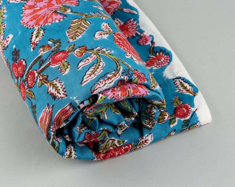 Teal Blue Carmine Red Punch Pink Indian Floral Hand Block Printed 100% Pure Cotton Cloth Fabric by the Yard Women's Clothing