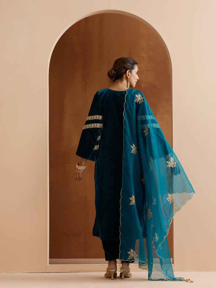 Teal Velvet Embroidery Straight Kurta Set with Straight Bottom and Scalloped Dupatta Velvet Top and Bottom With Organza Dupatta