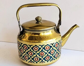 Teal enamel steel tea pot with vibrant folk floral pattern and white ceramic handle, at wholesale prices.