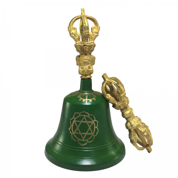 Teal green painted Tibetan bell featuring intricate gold-painted Chakra symbols and patina bronze dorje set, at wholesale prices
