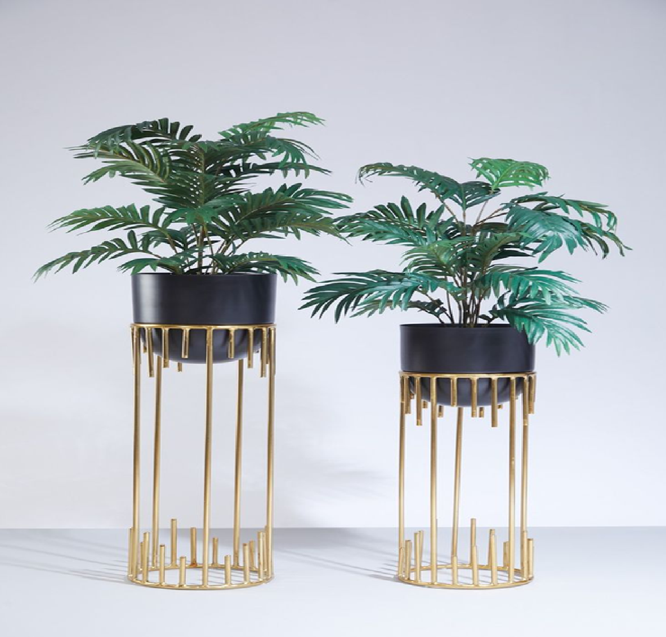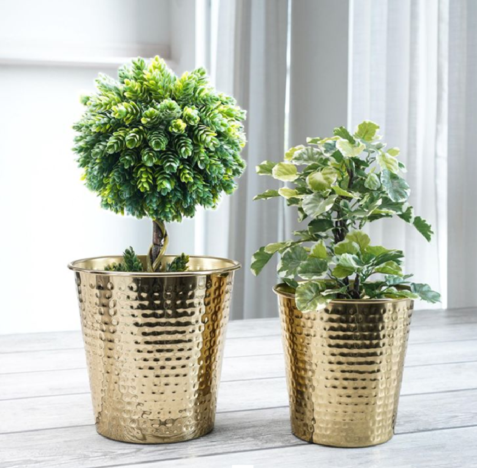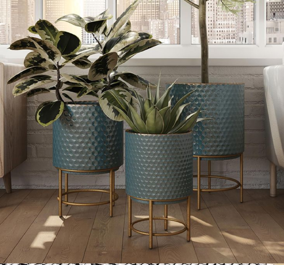 Teal hammered metal planters, gold stands, modern geometric texture, elevated indoor pots, available at wholesale prices.