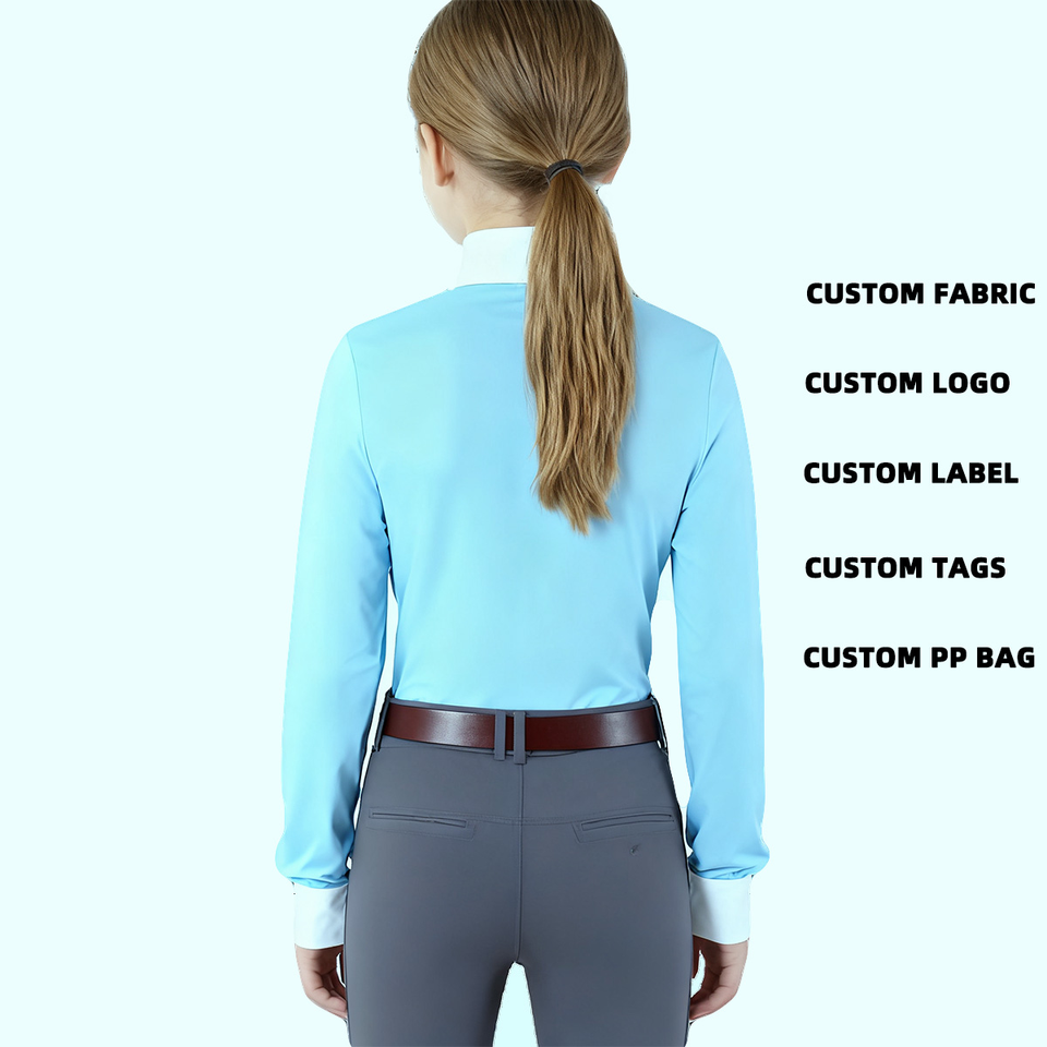 Teenage Kids Equestrian Shirt Half Button Long Sleeve White Blue Horse Riding Shirt Equestrian Show Shirts for Children