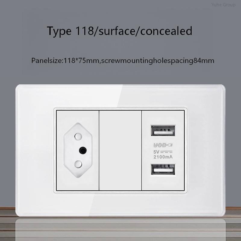 Tempered Glass Brazilian Standard Dual USB-C Touch Panel Wall Socket with Light Switch and Three Power Supplies