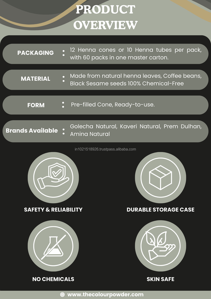 Packaging:12 Henna cones & 10 Henna Tubes Per Pack