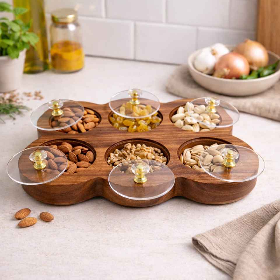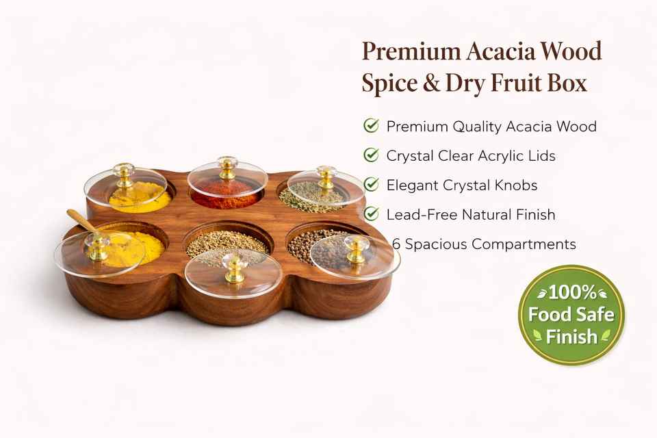 Test Passed Handcrafted Rectangular Spice Box Masala Dabba Acrylic Lid with 6 Round Compartments Acacia Wood Dry-Fruit Box Set