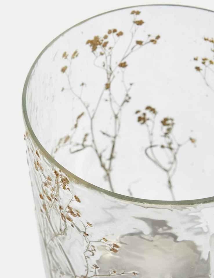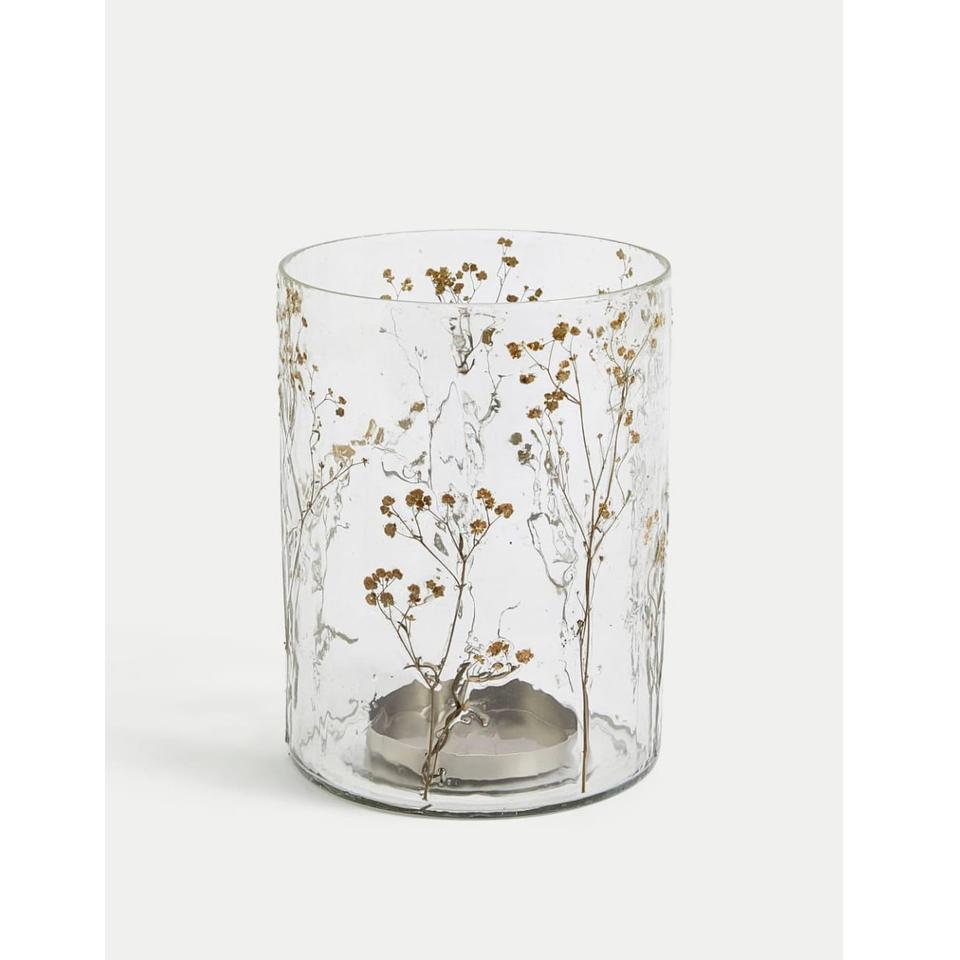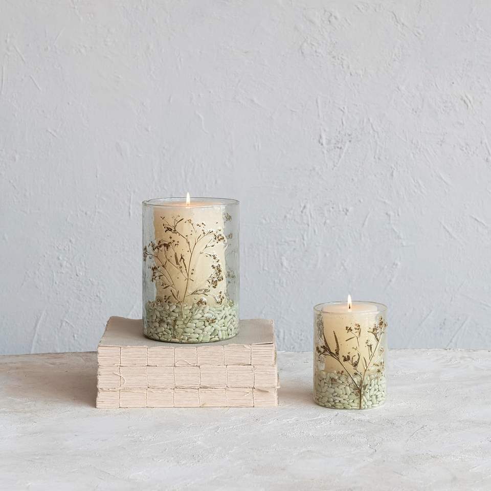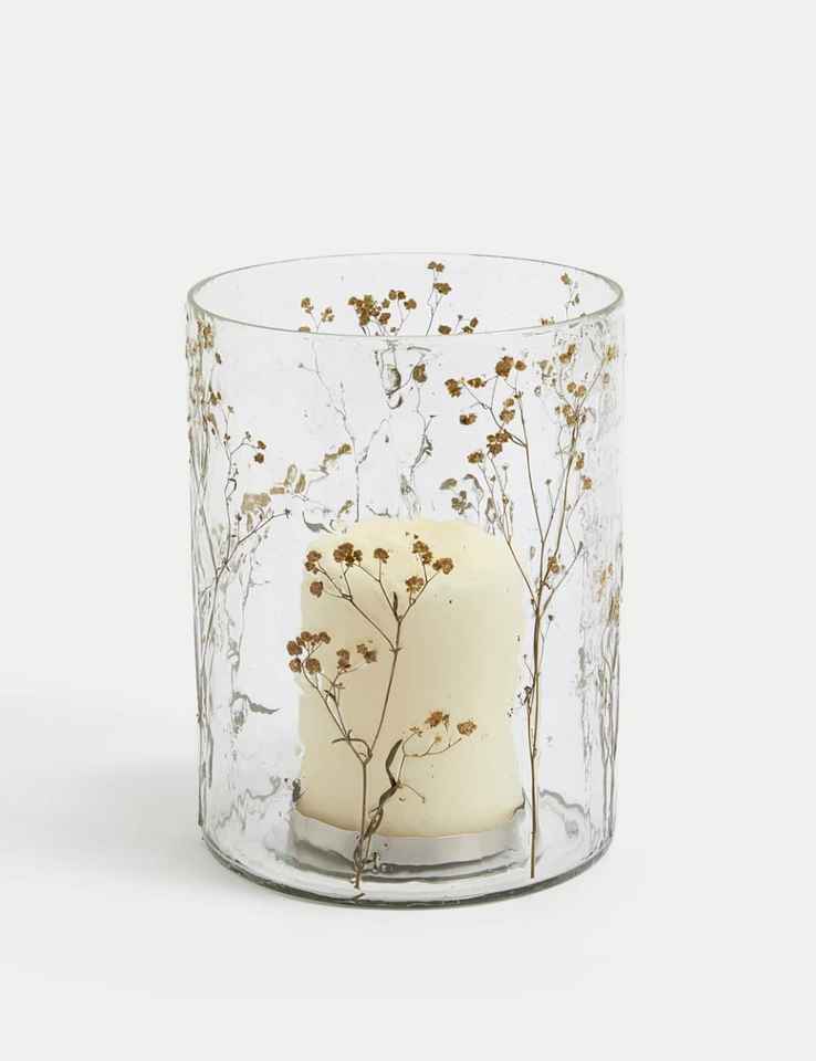 Textured Glass Hurricane Candle Holder Unique Handmade Christmas Lantern with Dried Natural Flowers and Embedded Botanicals