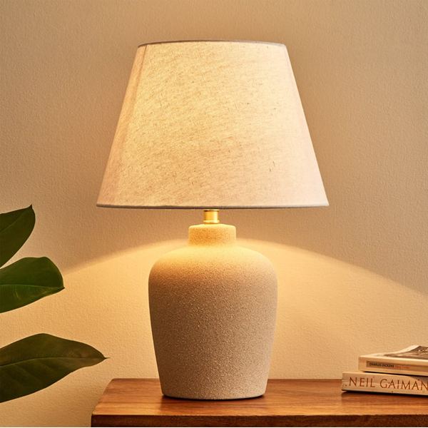 Textured sand-finish ceramic base lamp with a fabric shade. Available at wholesale prices