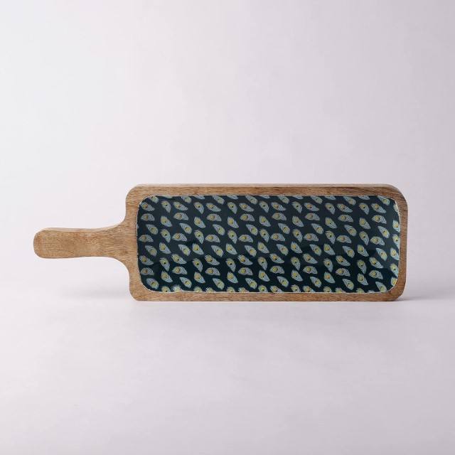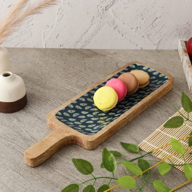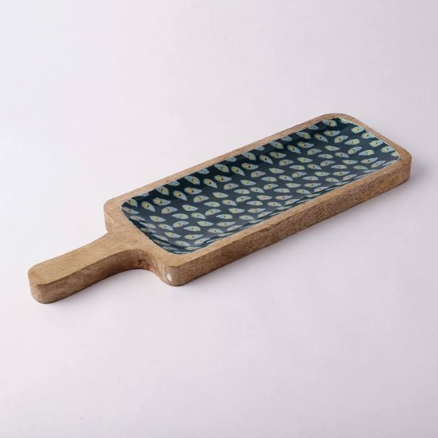 The Decor Mart Mango Wood Teal Peacock Feather Printed Paddle Shaped Serving Platter Tray Kitchen Dining Home Decor