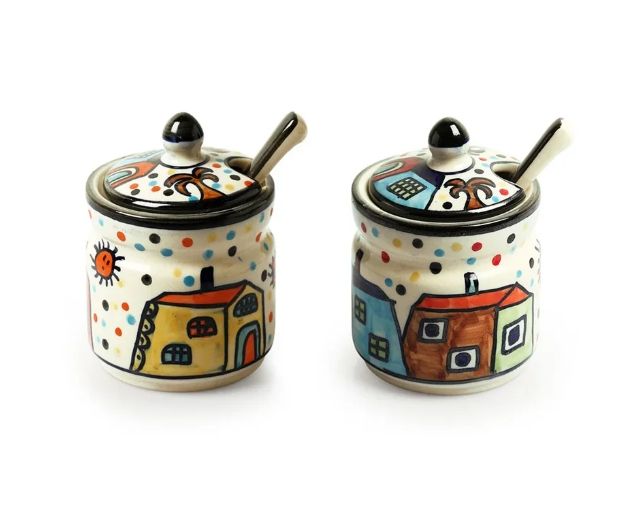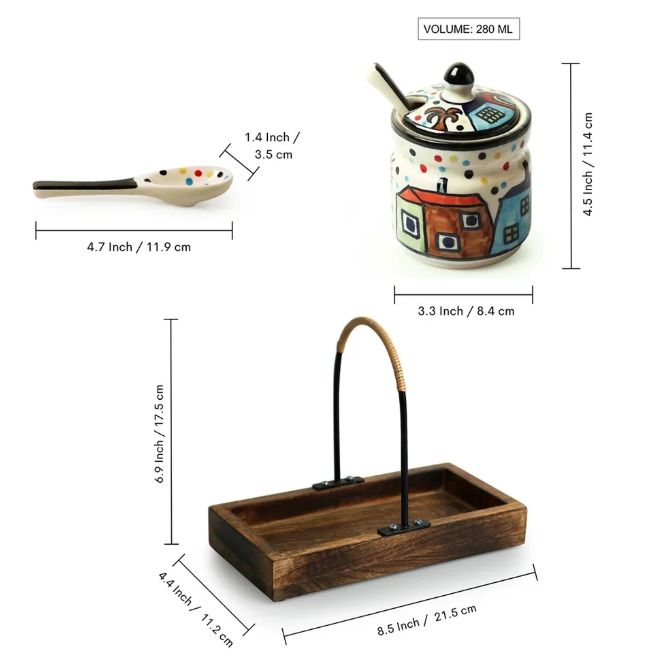 The Hut Hand-Painted Ceramic Pickle & Chutney Jar Set With Spoons & Wooden Holder Non Air-Tight Set Of 2 Ceramic Condiment Pot