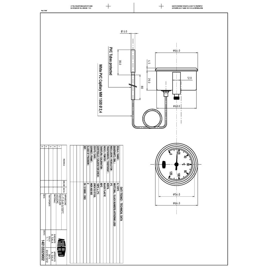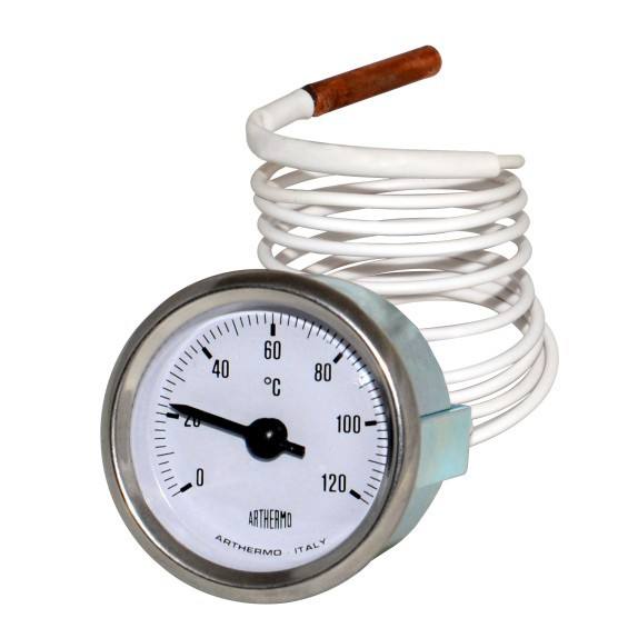 Thermometer C71 60 mm with zinc plated steel body and steel frame, capillary mm 1500 2,4 mm PVC coated, temperature range
