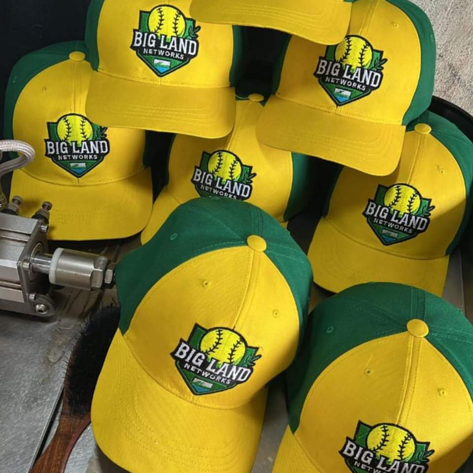 These are graphic print trucker caps, potentially by Snap City or Brim Caps