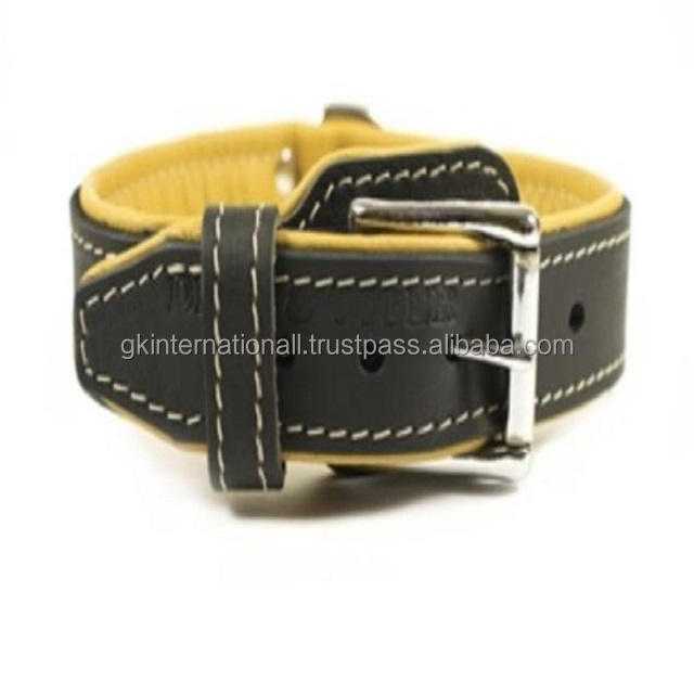 Thick Harness Leather Heavy Duty Dog Collar with Cow Softy Yellow Padding Stitched Inside and Nickel Plated Brass Hardware