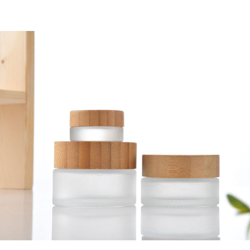 Thick-bottomed glass cream jar with bamboo and wood lid, cream jar, matte frosted glass face cream jar.