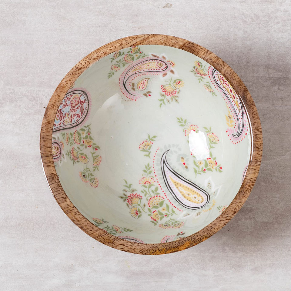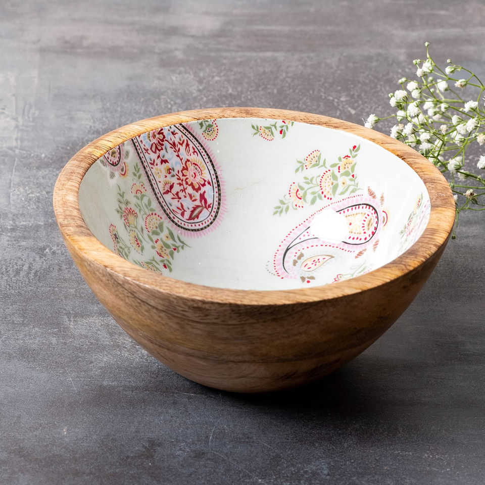 This Stunning Wooden Bowl Features a Polished Exterior Enamel Printed Inside Tabletop Dinnerware Rice Serving Bowl Kitchenware