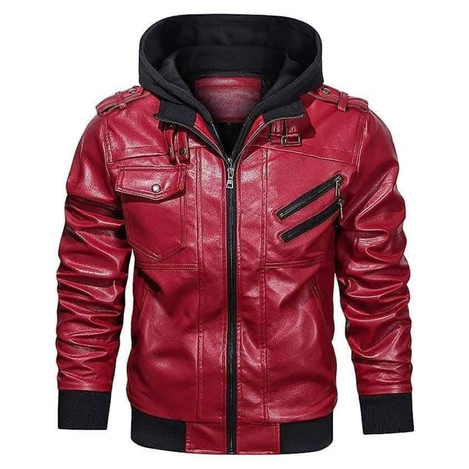 This is a Hood Crew men's red PU faux leather jacket with a removable hood