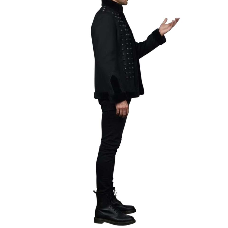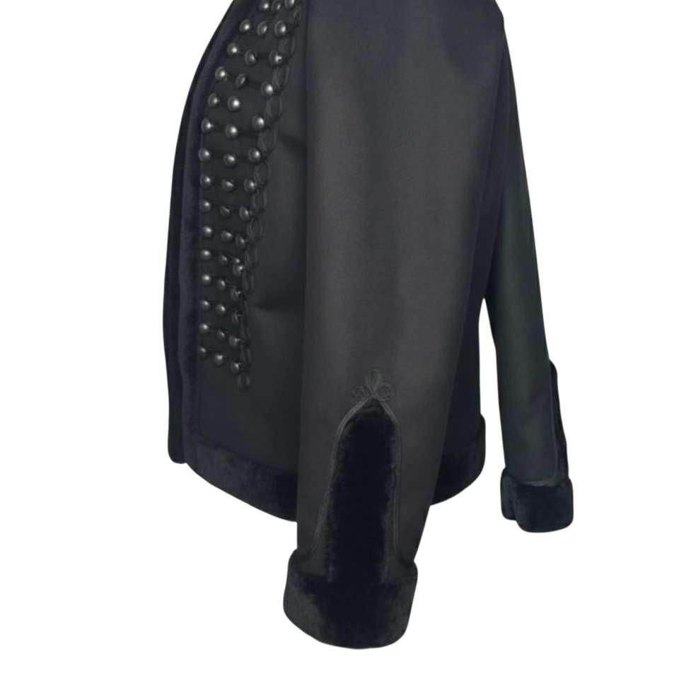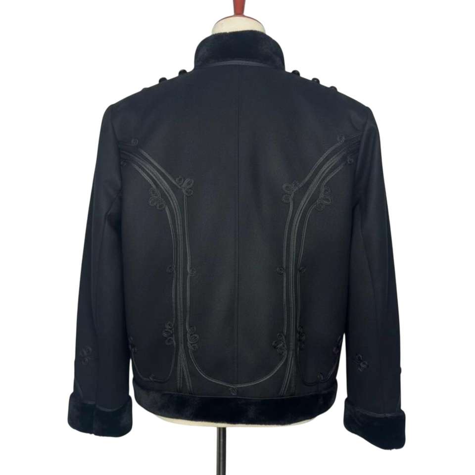 This is a black leather parade jacket with fur trim and silver buttons, also known as a hussar or dolman jacket