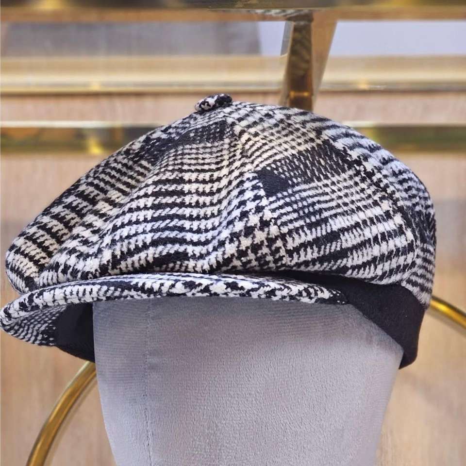 This is an 8-panel newsboy cap in a wool-blend, red, black, and grey checked pattern fabric